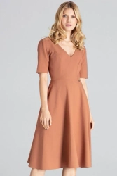 Rozkloszowana sukienka midi z dekoltem V brązowa