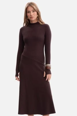 Bawełniana sukienka dzianinowa z golfem rozkloszowana brąz