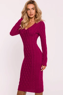 Sweterkowa sukienka z dekoltem V i modnym splotem różowa