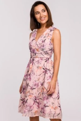 Sukienka szyfonowa w kwiaty bez rękawów dekolt V różowa