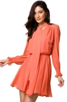 - Pomarańczowa sukienka koszulowa - sukienka przypominająca koszulę, zwykle z guzikami lub paskiem w talii. Idealna na casualowe okazje, np. na spotkania biznesowe.