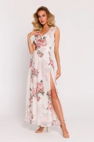Długa sukienka szyfonowa w kwiaty z rozcięciem na nodze ecru