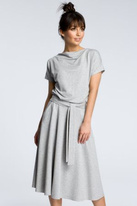 Rozkloszowana sukienka midi z paskiem w talii zbluzowana góra szara