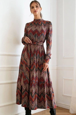 Długa sukienka BOHO z falbankami i długim rękawem zielona
