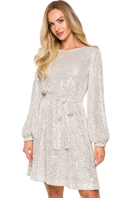 Sukienka cekinowa trapezowa z paskiem błyszcząca szampańska