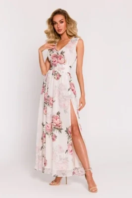 Długa sukienka szyfonowa w kwiaty z rozcięciem na nodze ecru