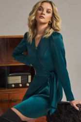 Sukienka satynowa kopertowa mini z wiązaniem w talii zielona