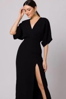 Długa sukienka z dekoltem V i rozcięciem kimonowa czarna