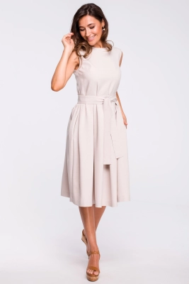 Lniana sukienka trapezowa na lato bez rękawów z marszczeniem różowa