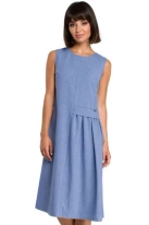 Lniana sukienka trapezowa na lato bez rękawów z marszczeniem niebieska