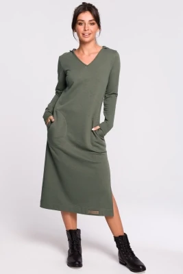 Długa sukienka dresowa kaptur i dekolt V bawełniana zielona