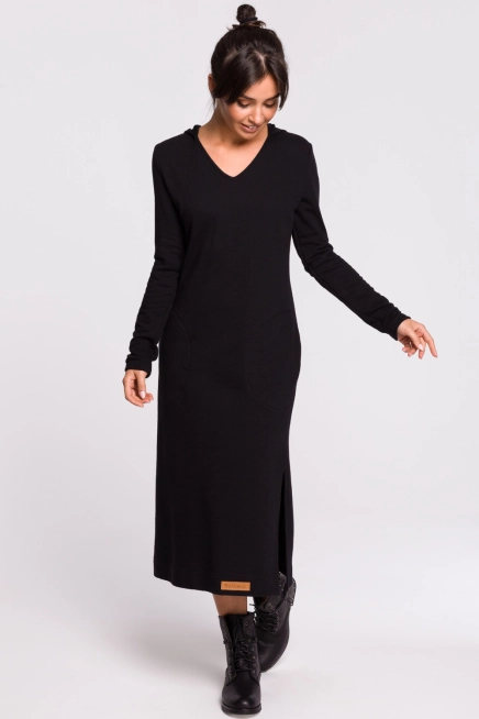 Opinie o Długa sukienka dresowa kaptur i dekolt V bawełniana czarna