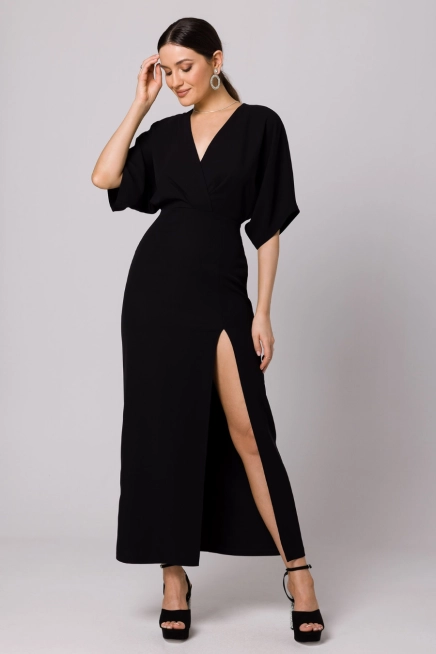 Długa sukienka z dekoltem V i rozcięciem kimonowa czarna