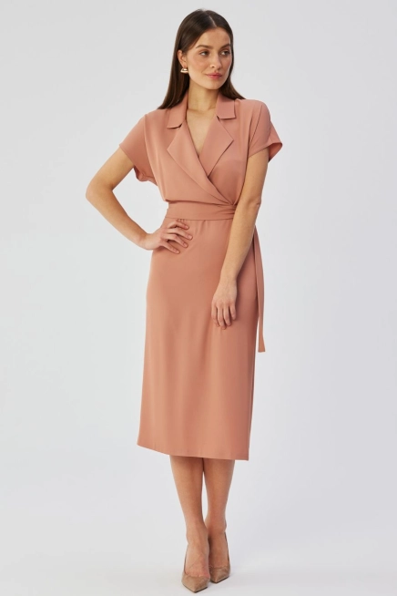- Sukienka dopasowana dołem pięknie podkreśla figurę, a kimonowa kopertowa góra z wykładanym kołnierzem dodaje elegancji