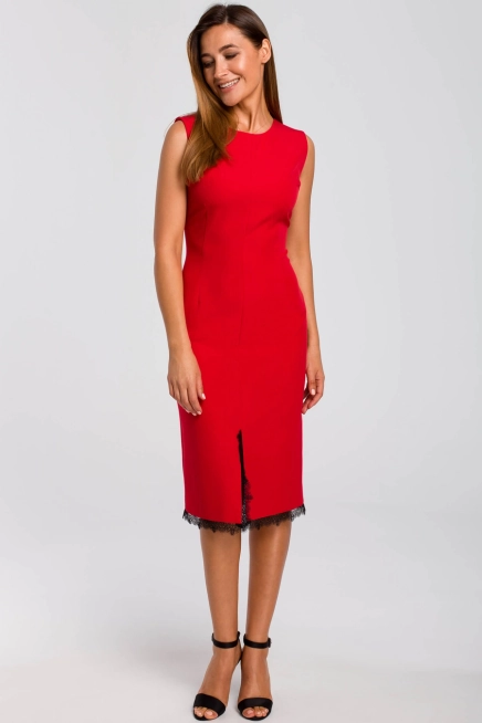Elegancka sukienka ołówkowa z rozcięciem i koronką czerwona