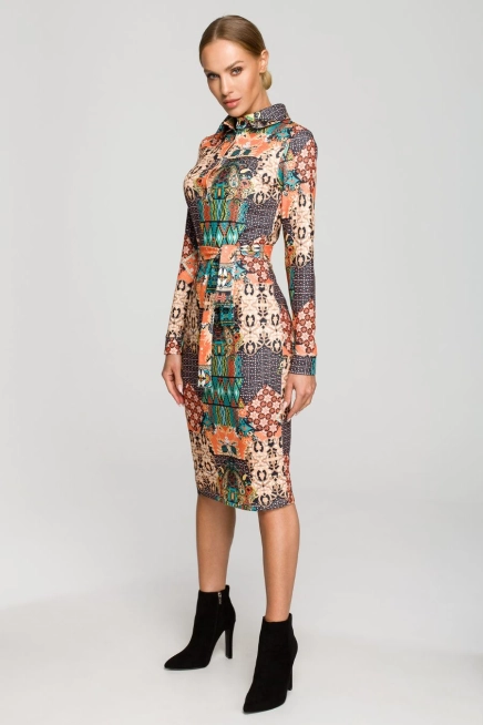 Ołówkowa sukienka z koszulową górą z kołnierzykiem uszyta z elastycznej dzianiny przykuwa uwagę od pierwszego spojrzenia! Kolorowy nadruk sukienki już sam w sobie robi furorę, ale zadbaliśmy także o detale: kołnierzyk, zapięcie pod szyją i pasek do przewiązania, który dodatkowo podkreśli talię. Sukienka wkładana przez głowę. Zrobi furorę jako sukienka wizytowa, sukienka do pracy, sukienka na spotkanie, sukienka na kolację, czy sukienka na randkę. Dobierz do niej swoje ulubione dodatki i stwórz własną, wyjątkową stylizację. Bardzo dobra jakość, ta polska sukienka została uszyta w rodzimych szwalniach.