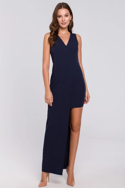 Długa sukienka wieczorowa z asymetrycznym dołem i dekoltem V - granatowa: