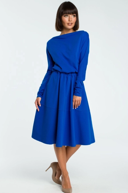 Rozkloszowana sukienka dresowa z gumką w pasie i kieszeniami Swobodna góra z długimi rękawami i dekoltem typu woda. Ta bawełniana sukienka rozkloszowana to sukienka na każdą figurę. Przykuwa uwagę od pierwszego spojrzenia! Ma elastyczną talię i długość za kolano a po bokach kieszenie. Dobierz do niej swoje ulubione dodatki i stwórz własną, wyjątkową stylizację. Bardzo dobra jakość, sukienka została uszyta w Polsce.