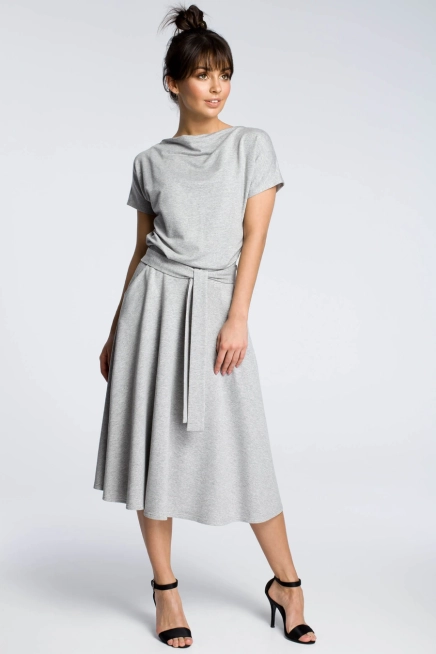 Rozkloszowana sukienka midi z paskiem zbluzowana góra szara