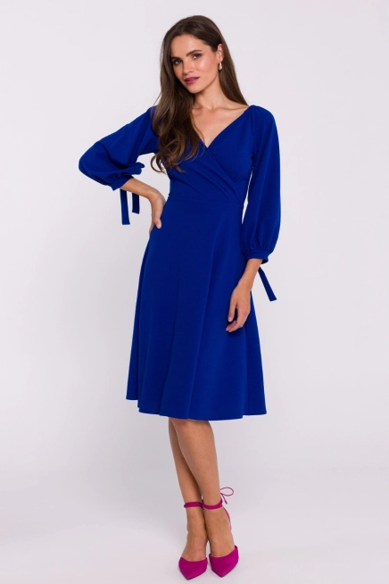 Rozkloszowana sukienka z kopertowym dekoltem chabrowa