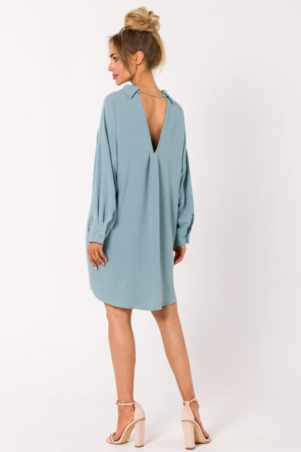 - Sukienka - tunika jak koszula oversize z dekoltem i łańcuszkiem na plecach. Swobodny, zwiewny fason idealny dla luźnych stylizacji