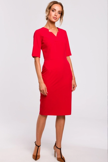 - Elegancka czerwona sukienka ołówkowa midi z dekoltem V. Dopasowany fason z podwyższoną talią, wysokiej jakości tkanina z wiskozą. Idealna sukienka biznesowa i wizytowa, uszyta w Polsce.