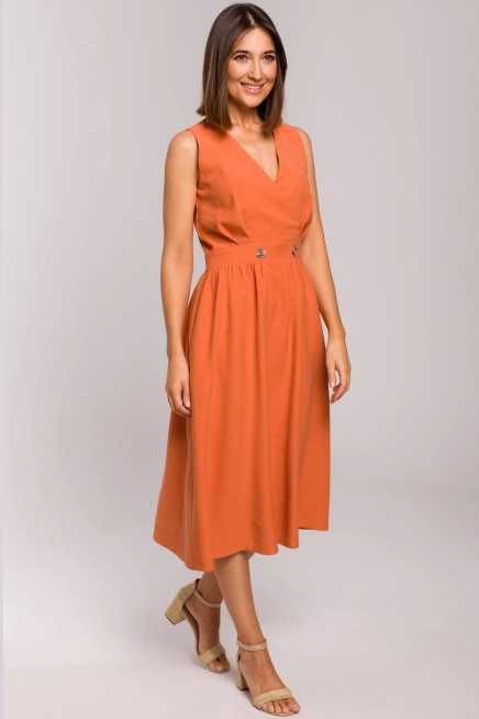 Dekolt w kształcie litery V w połączeniu z kopertowym fasonem subtelnie wysmukla górę ciała. Sukienka bez rękawów na szerokich ramiączkach została dodatkowo ozdobiona dwoma dużymi guzikami w talii, które podkreślają kształt sylwetki i nadają wyjątkowego charakteru.