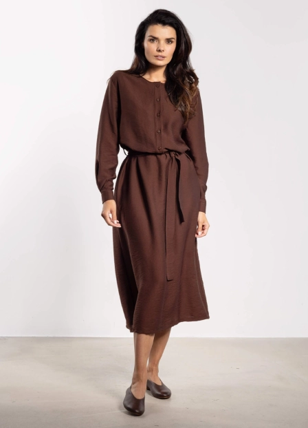 Sukienka rozkloszowana z długim rękawem i paskiem brązowa
