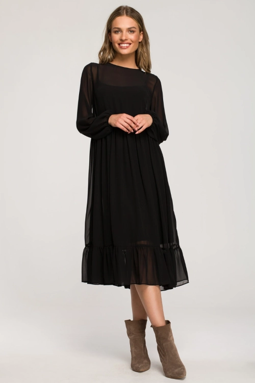 Wieczorowa, rozkloszowana sukienka szyfonowa z falbaną - czarna: