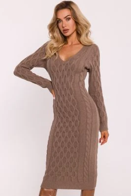 Sweterkowa sukienka z dekoltem V i modnym splotem beżowa